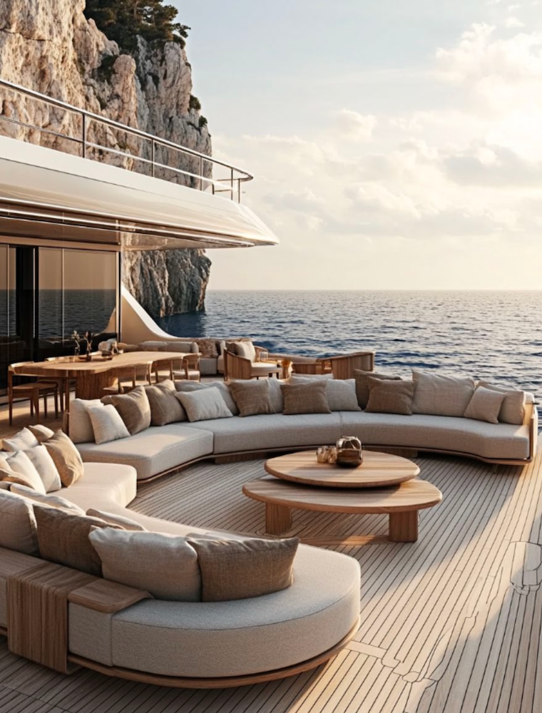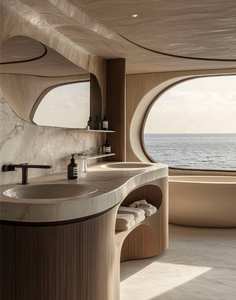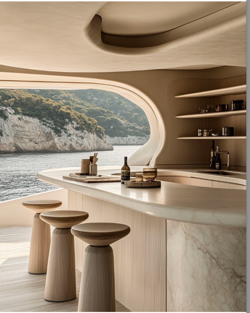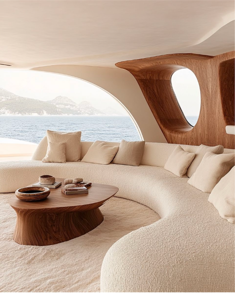 Large windows, soft natural light, and tactile textures strengthen the connection to the sea and the surrounding landscape.